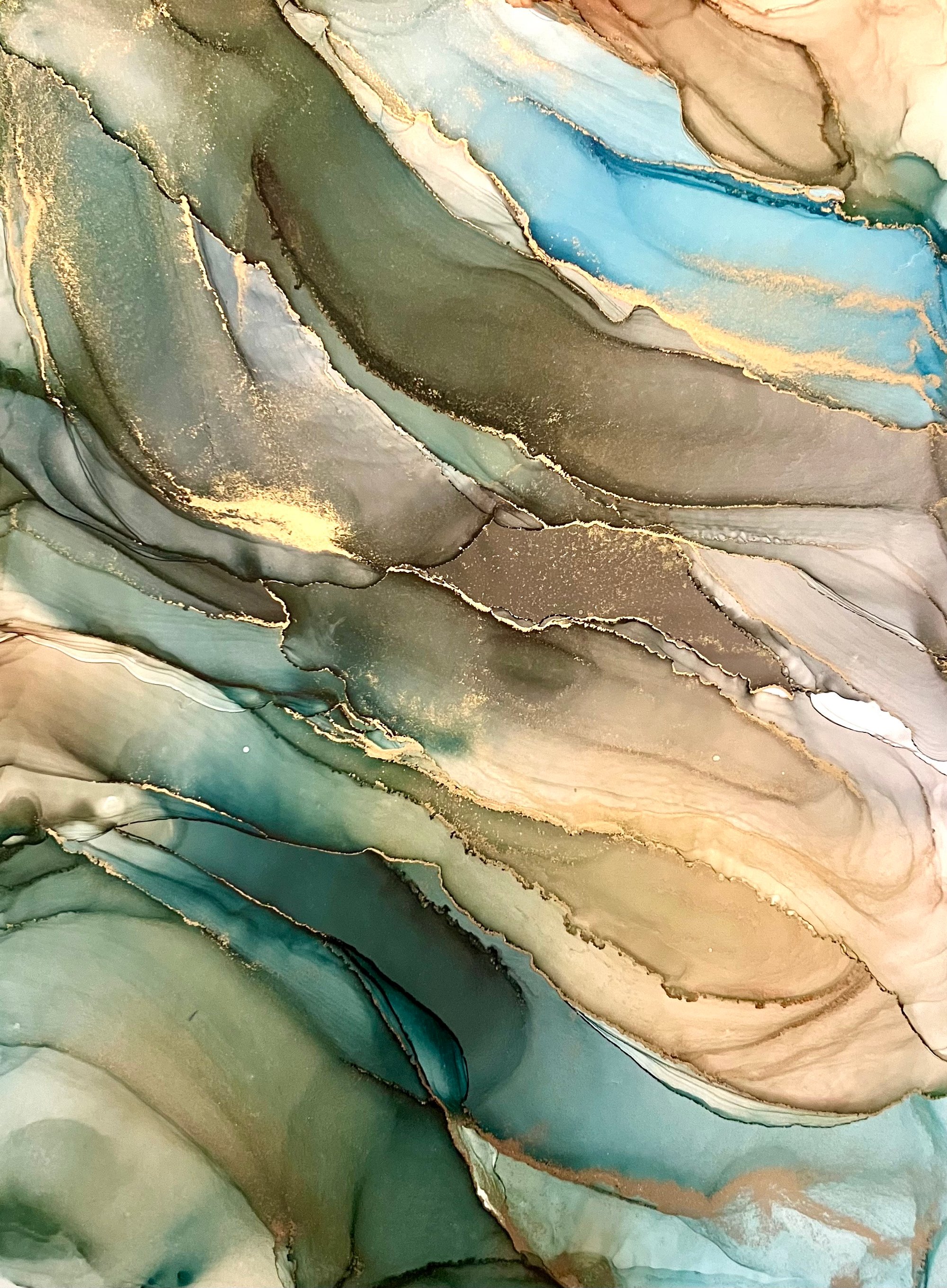 9"x12" alcohol ink on synthetic paper displaying earthy hues of blue, green, brown and metallic brass which when captured in light will delight your eyes.