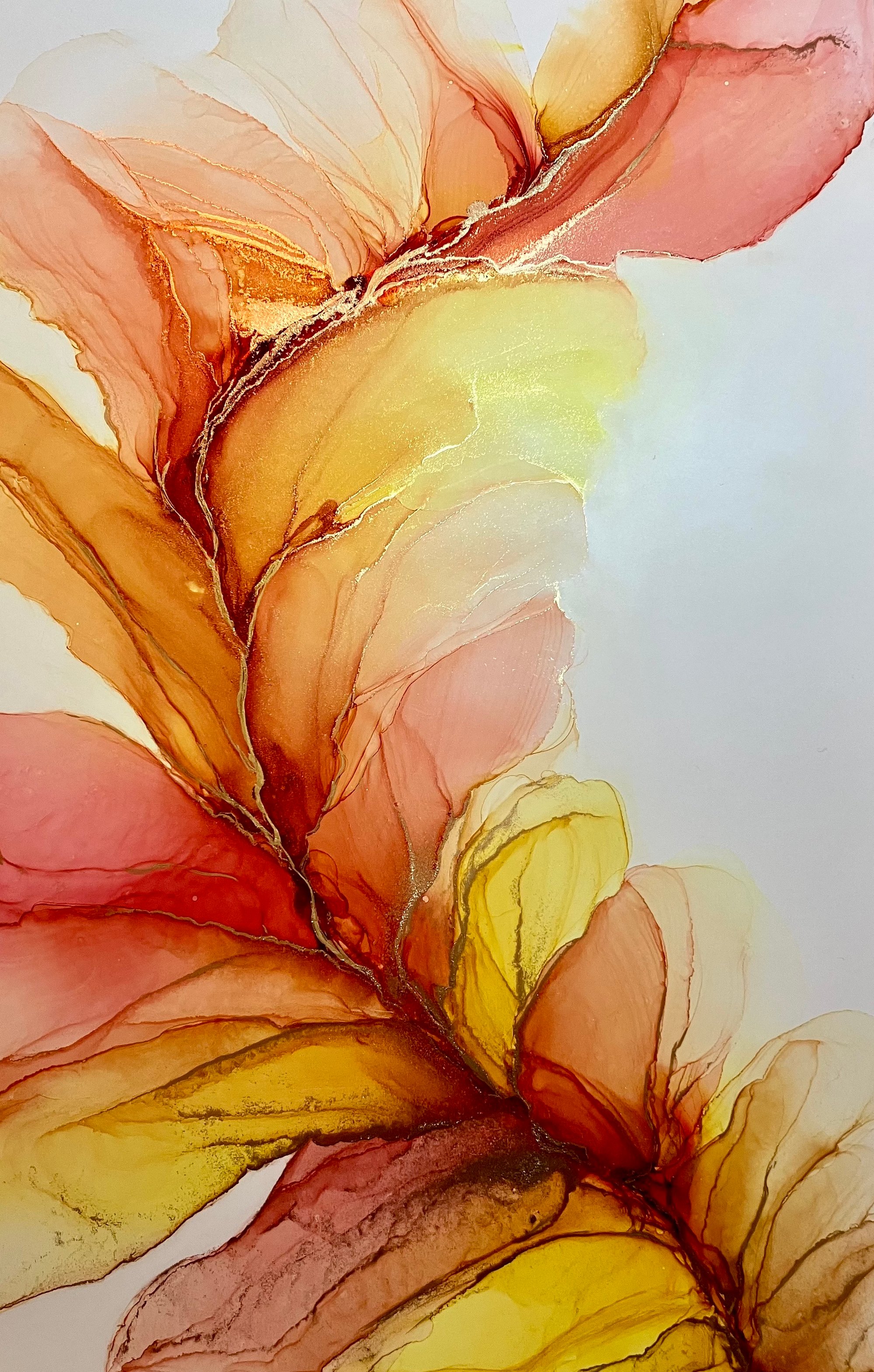 12"x18" alcohol ink on synthetic paper. Warm up any room with this bright and colorful piece.