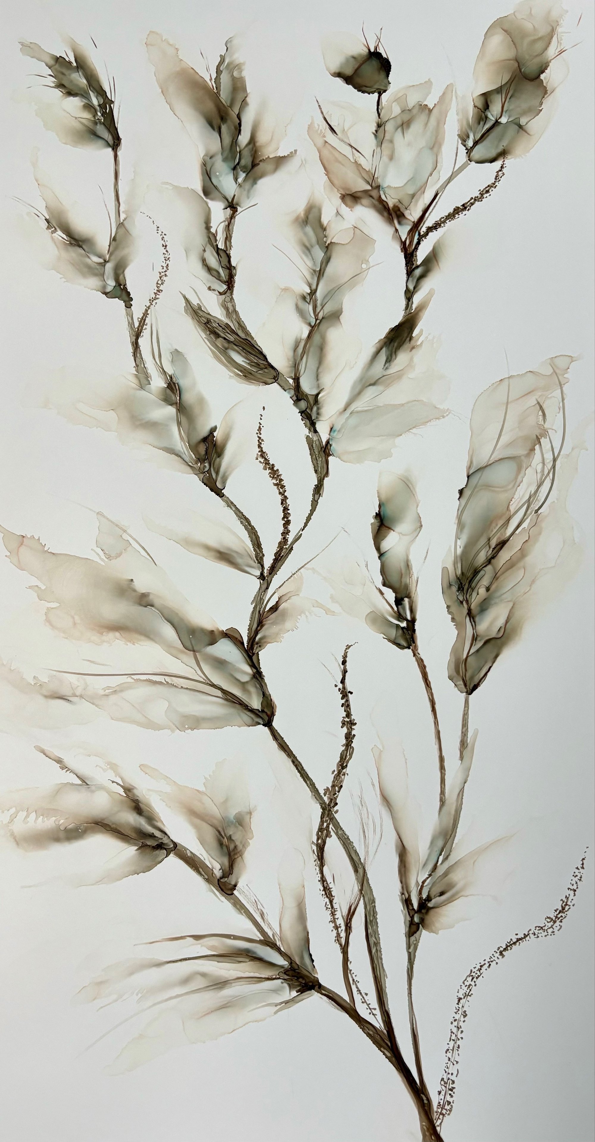 10"x18" Alcohol ink on synthetic paper. Beautiful mushroom ink transforms in to a soft, ethereal foliage.